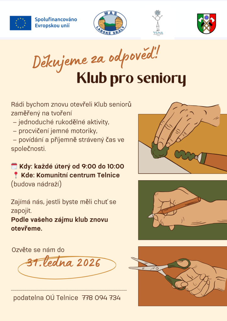 Plánujeme znovuotevření seniorského klubu, v případě zájmu nás můžete kontaktovat. Pokud se naplní kapacita, bude klub fungovat každé úterý od 9:00h. Více info v letáku.